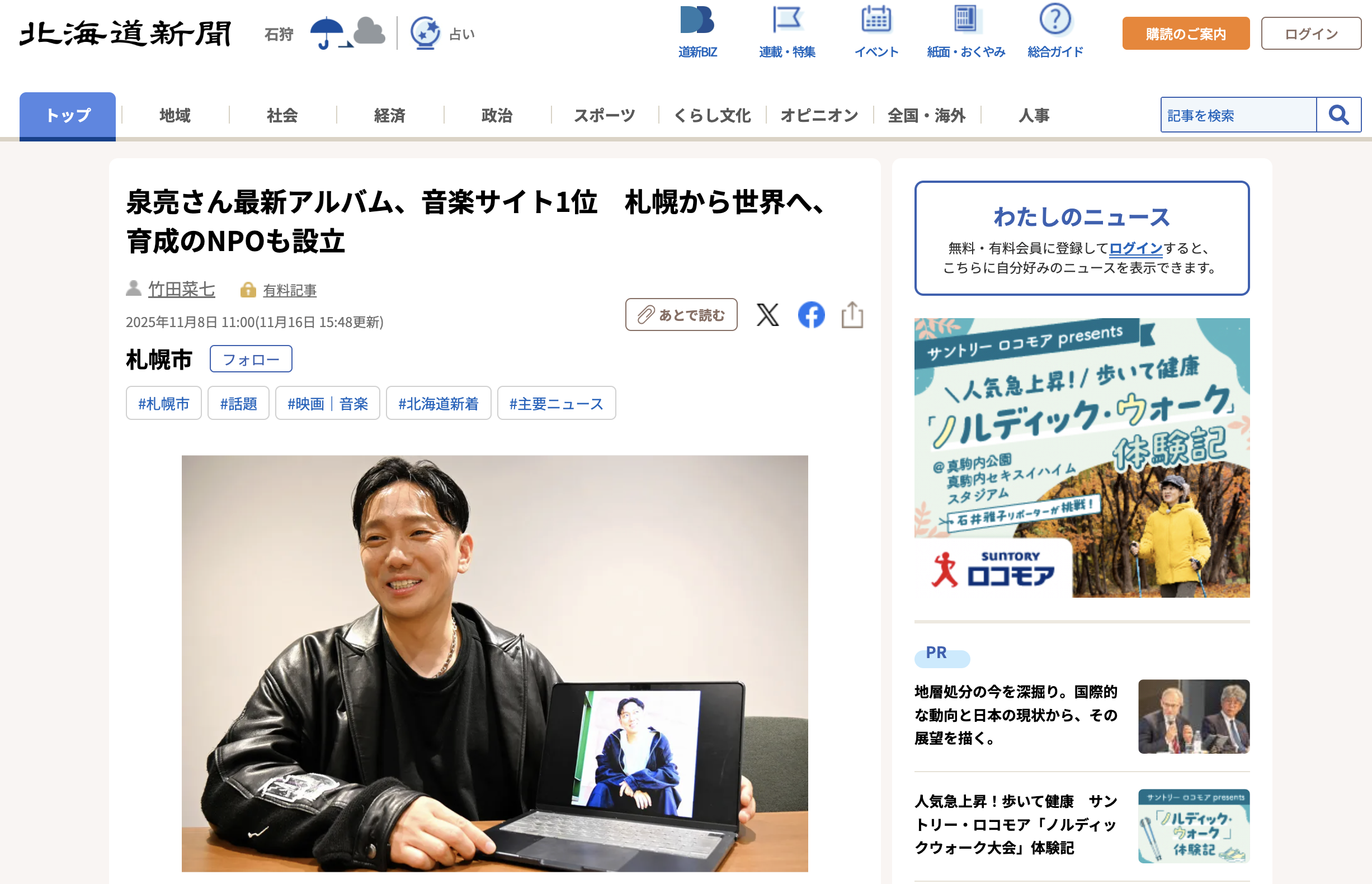 本日11/13の 北海道新聞 朝刊 に、泉 亮のインタビューが掲載されました。